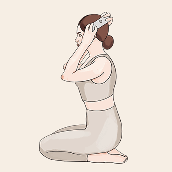 Krok 1: Usiądź na piętach lub na krześle. Zegnij prawą rękę. Lewą ręką chwyć górny tylny róg głowy (nad prawym uchem) i powoli pociągnij głowę jak najdalej pod kątem 45 stopni w lewo, w kierunku lewego łokcia. Trzymaj plecy prosto i pociągnij prawe ramię w dół w kierunku prawego biodra tak bardzo, jak to możliwe.